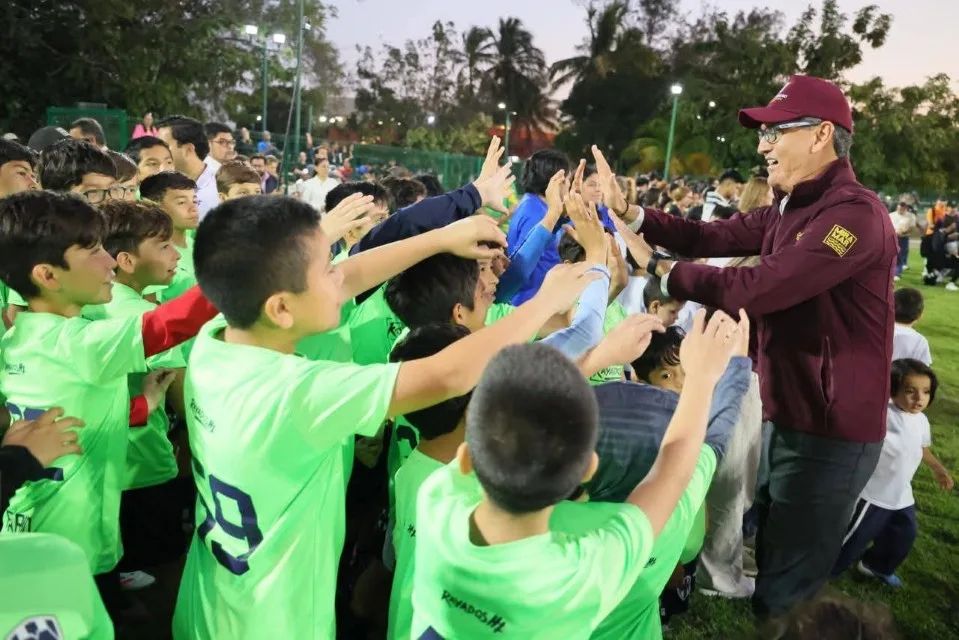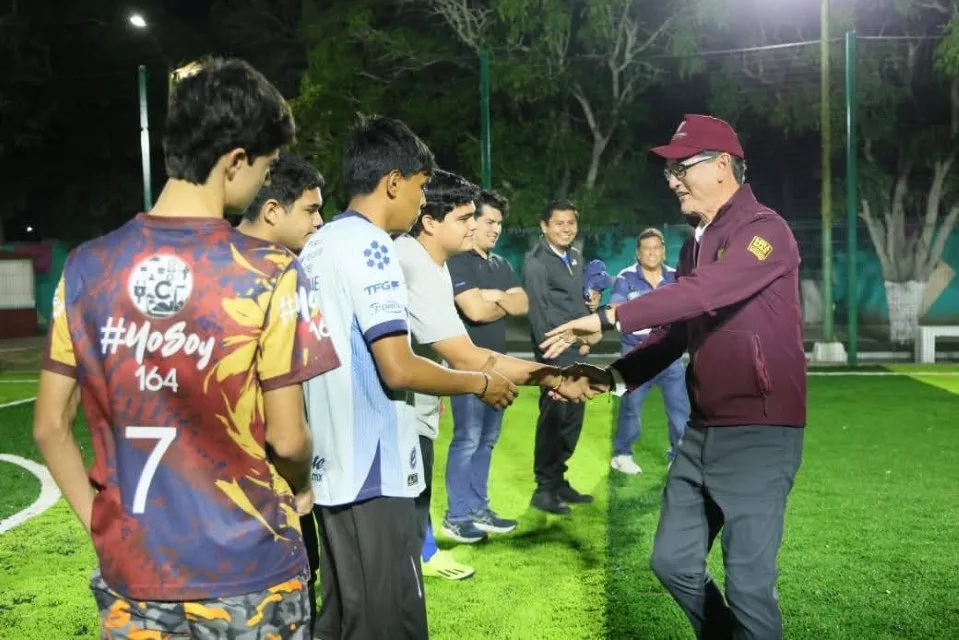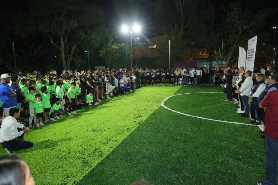 El presidente municipal Erasmo González Robledo entregó la rehabilitación de dos canchas de fútbol en el parque de Ampliación Unidad Nacional: una con pasto natural y otra sintético, invirtiendo 1.5 mdp del FORTAMUN. Acompañado de Dunia Marón Acuña del DIF, síndicos y regidores, destacó promoción de estilos de vida saludables y convivencia. Incluye volibol, básquetbol y módulo seguridad.