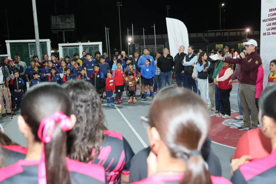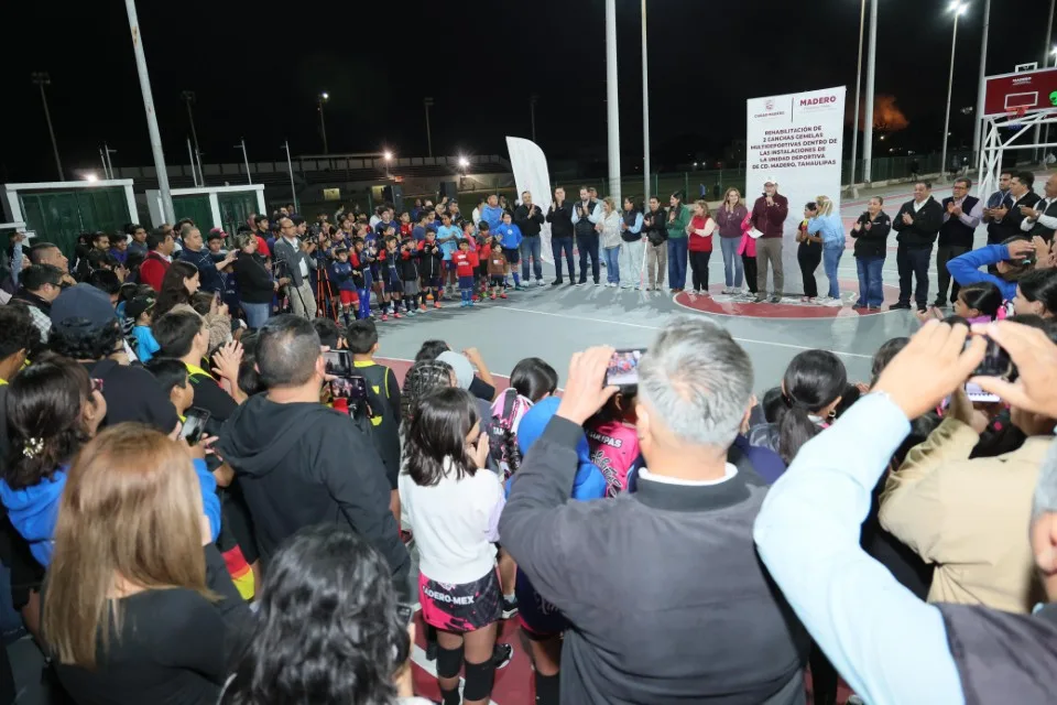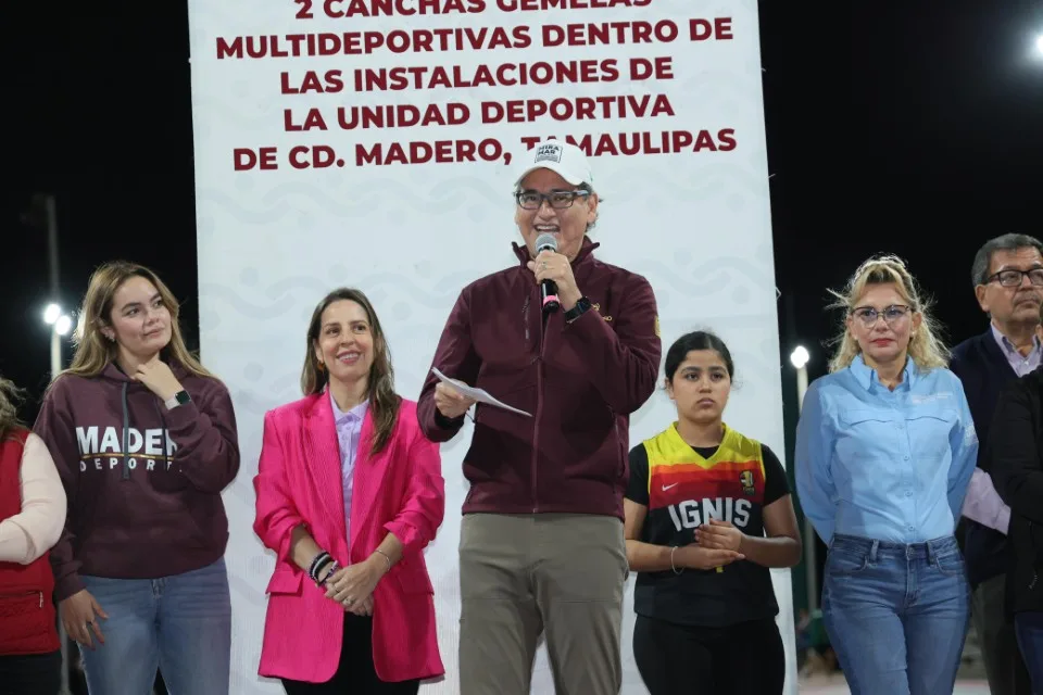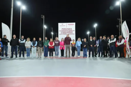 El presidente municipal de Ciudad Madero, Erasmo González Robledo, junto a la presidenta del DIF Dunia Marón Acuña, entregó dos canchas multifuncionales en la Unidad Deportiva. Estas obras fortalecen la infraestructura deportiva y promueven estilos de vida saludables entre niños, jóvenes y adultos. La directora de Deportes, Jade Yáñez Rodríguez, acompañó el evento junto a cabildo y entrenadores.
