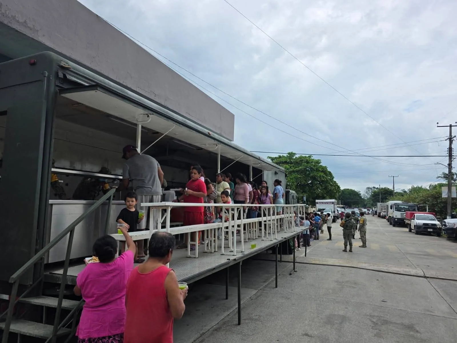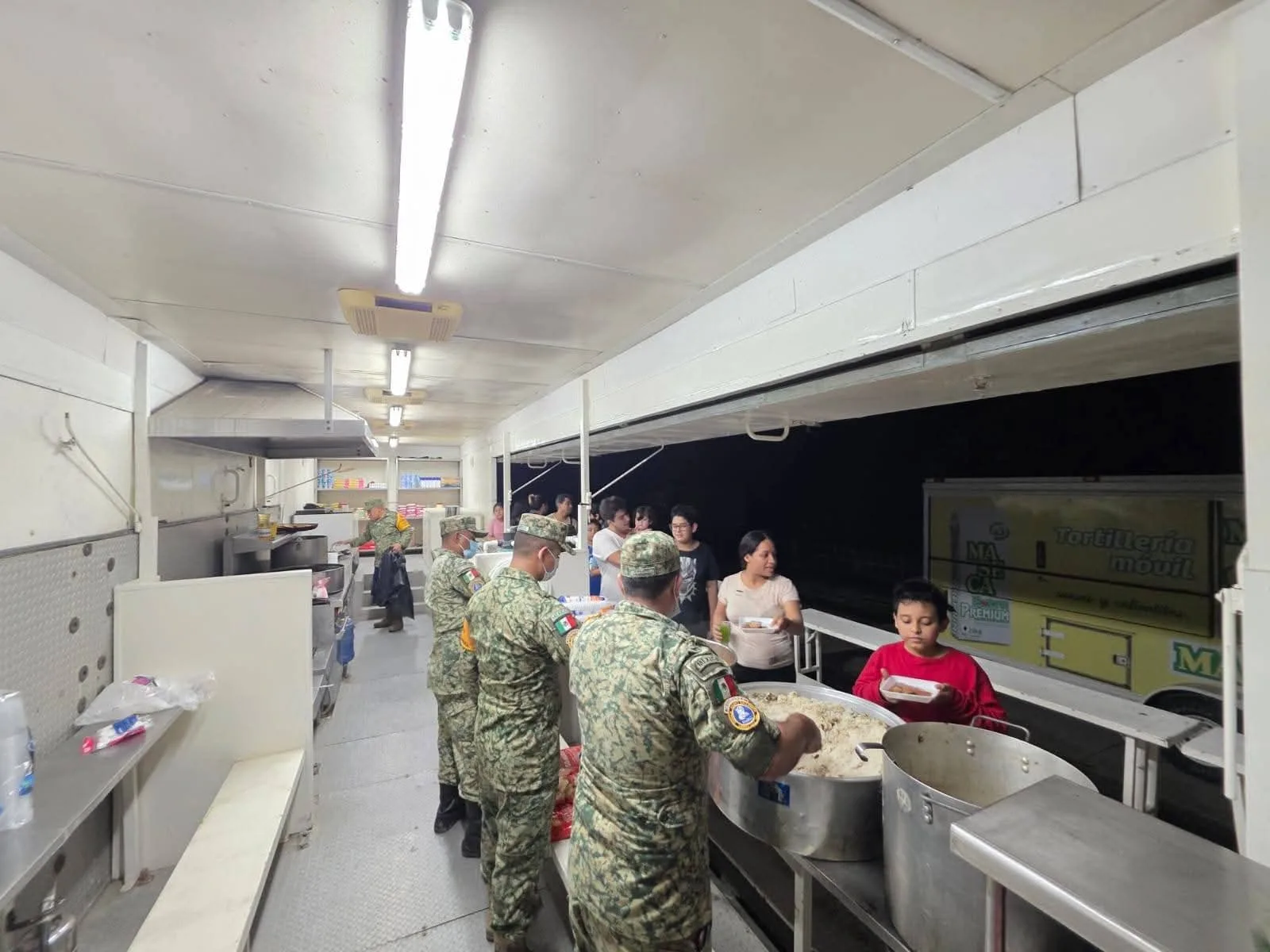 Además, el Ejército Mexicano instaló una cocina comunitaria con capacidad para preparar 2,500 raciones calientes diarias, garantizando alimentos a las familias que enfrentan condiciones difíciles tras las inundaciones. También se habilitaron dos plantas potabilizadoras de agua, cada una con capacidad para producir 1,000 litros diarios, asegurando el suministro de agua limpia para consumo humano.