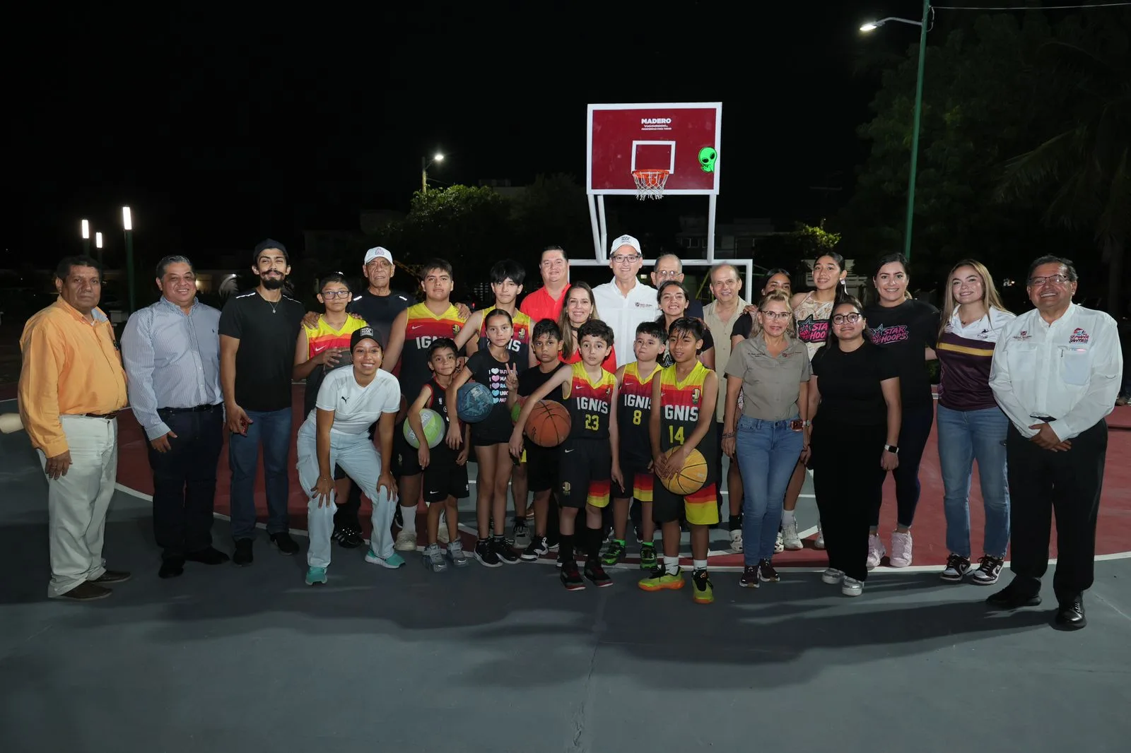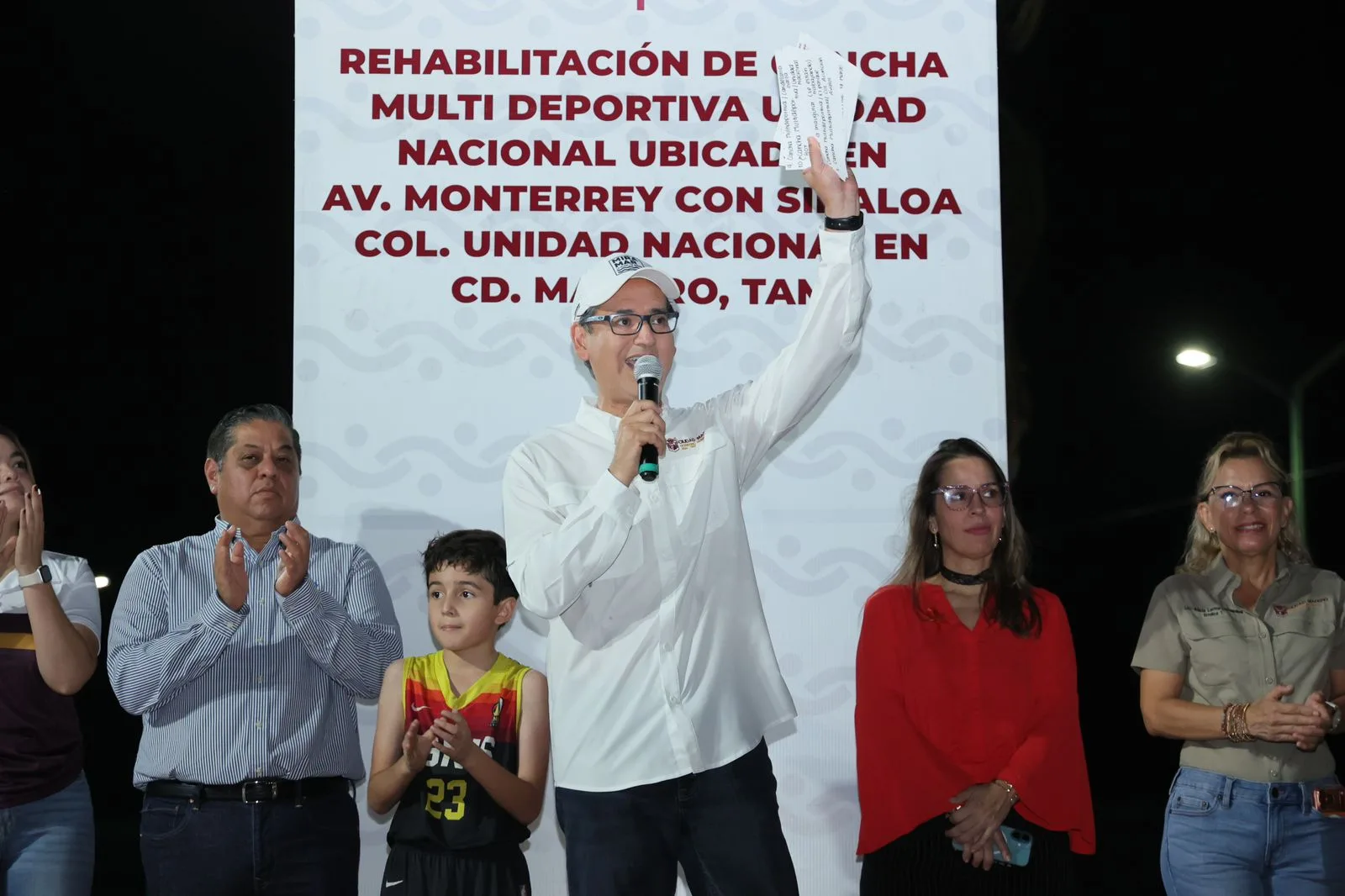 Las familias de la colonia Unidad Nacional en Ciudad Madero celebraron la reinauguración de una cancha multifuncional que permaneció en desuso durante años y que hoy vuelve a convertirse en un espacio digno para la práctica deportiva. El presidente municipal Erasmo González, acompañado de su esposa, la presidenta del DIF Madero, Dunia Marón Acuña, así como de síndicos y regidores, encabezó este evento en el que destacó la importancia de contar con infraestructura adecuada para impulsar el deporte y la convivencia familiar.