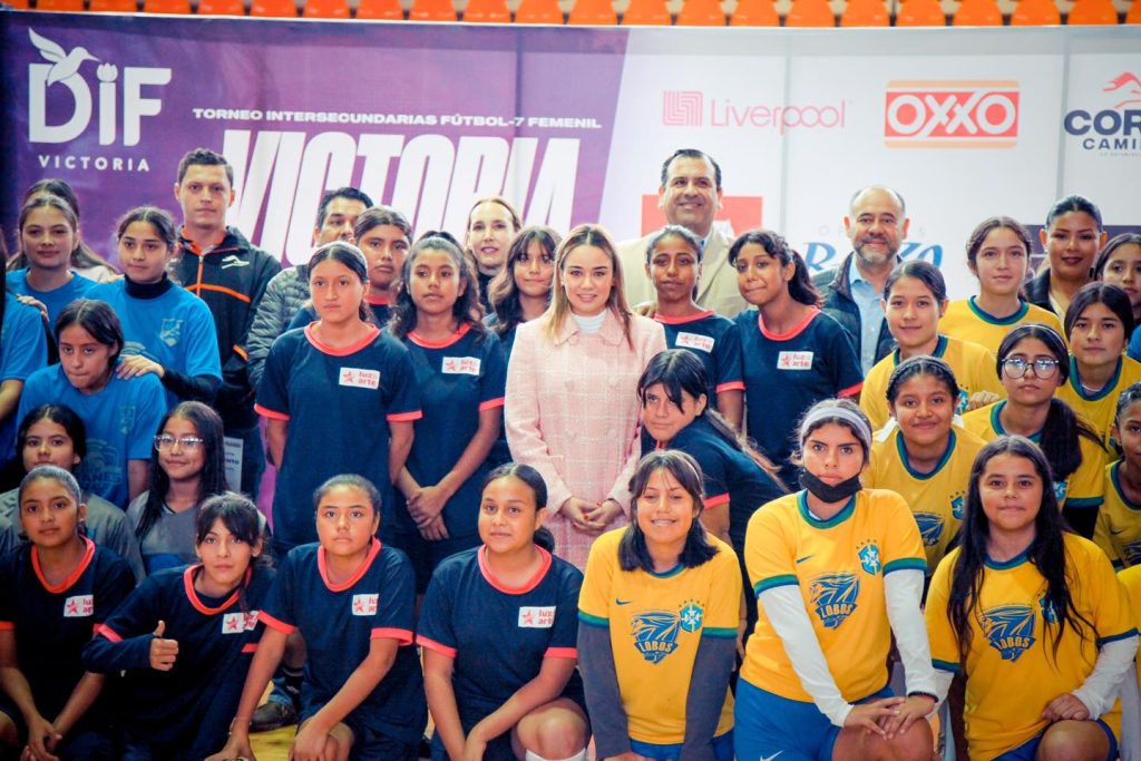 Lucy Rdz de Gattas, Presidenta del Sistema DIF Victoria, inauguró el torneo Fut-7 Femenil Intersecundarias “Te Quiero Más”. Este evento deportivo cuenta con la participación de 11 equipos de escuelas secundarias de Victoria y el apoyo de 29 empresas patrocinadoras.