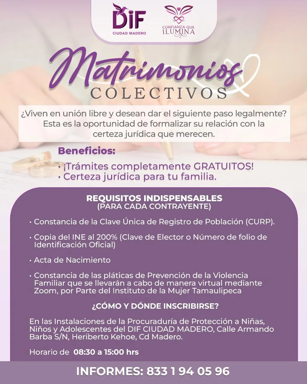 El proceso incluye acompañamiento institucional y asesoría gratuita para las parejas interesadas. Quienes deseen participar deberán presentar CURP, copia del INE al 200%, acta de nacimiento y constancia de pláticas de Prevención de la Violencia Familiar, impartidas por el Instituto de la Mujer Tamaulipeca.