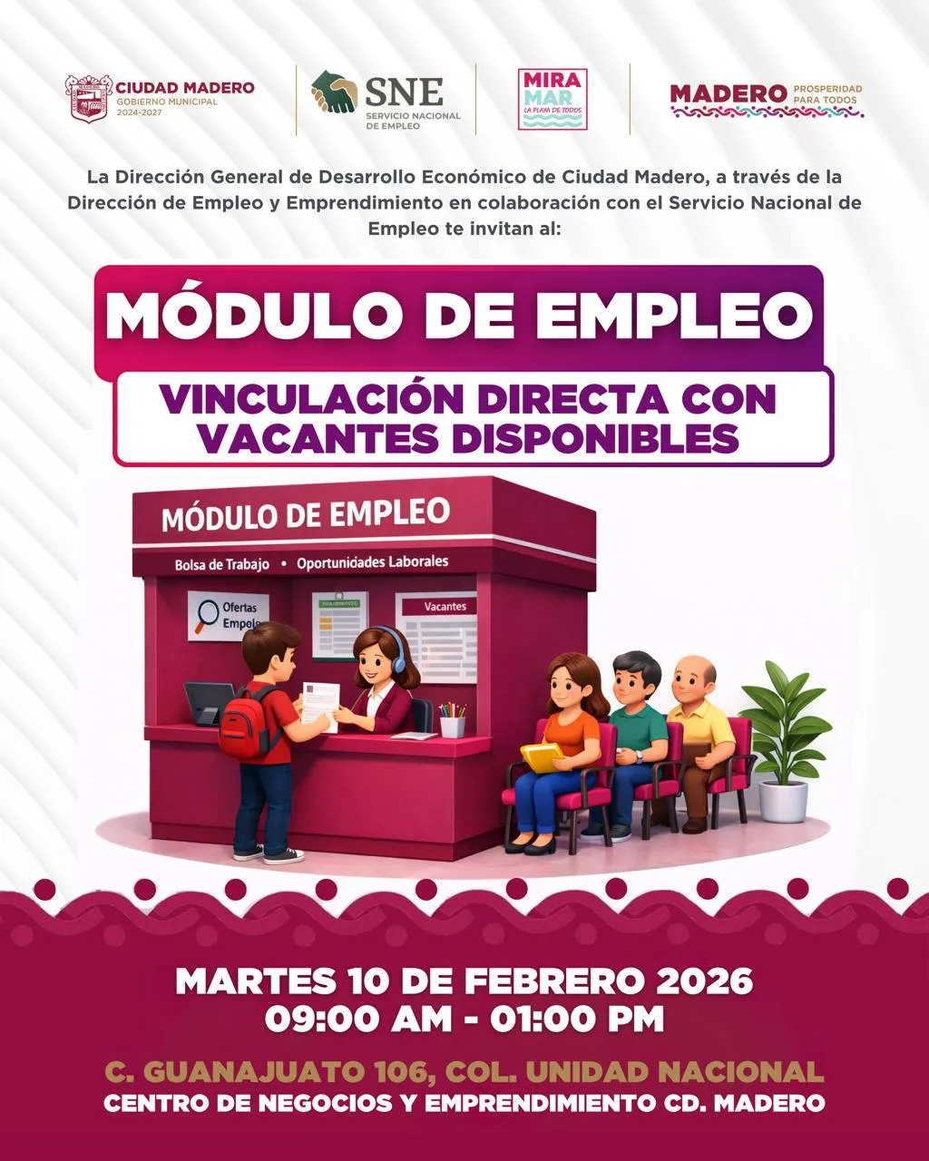 La Dirección General de Desarrollo Económico, a través de la Dirección de Empleo y Emprendimiento, instalará un módulo de empleo en el Centro de Negocios y Emprendimiento de Ciudad Madero, en Guanajuato 106, colonia Unidad Nacional. En colaboración con el Servicio Nacional de Empleo, ofrece vinculación directa a vacantes sin importar edad o género. El único requisito es presentar curriculum vitae actualizado con datos personales, experiencia y formación académica.