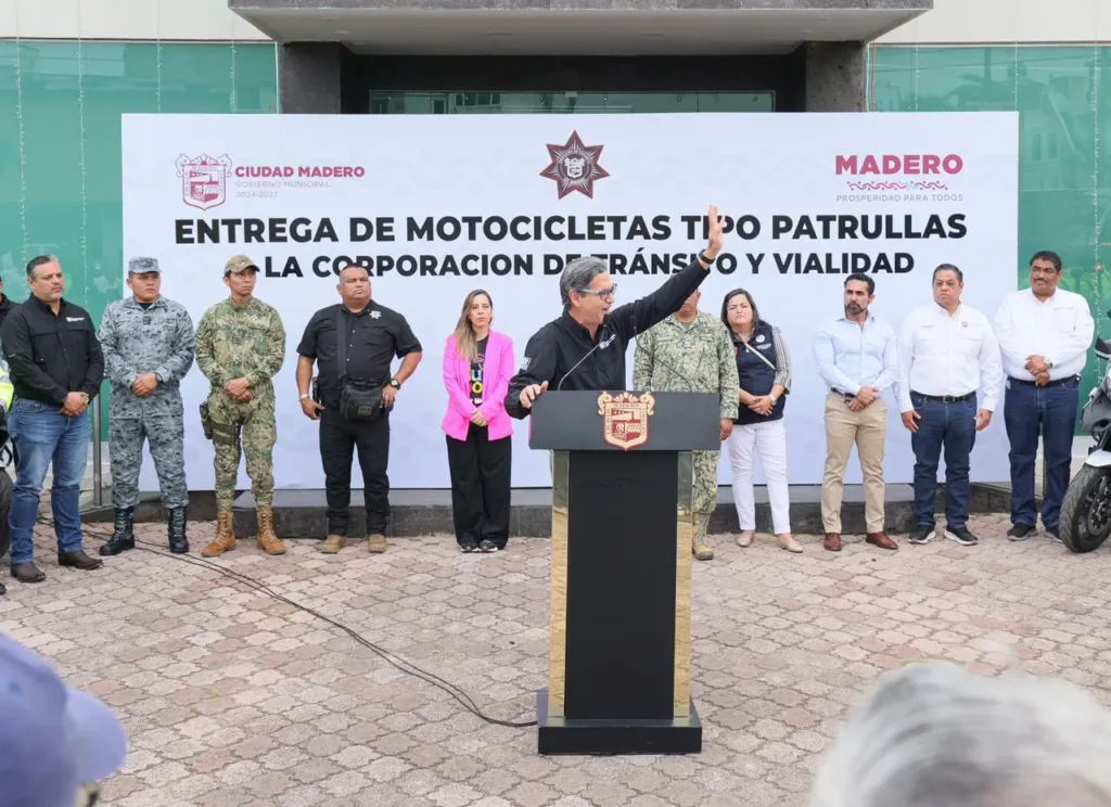 Con una inversión de 2.2 millones de pesos, el Ayuntamiento de Ciudad Madero adquirió 10 motocicletas tipo patrulla. Estas unidades, totalmente equipadas, permitirán que los agentes de vialidad brinden un servicio más ágil y eficiente en la atención de accidentes, control de tránsito y apoyo ciudadano. Durante la entrega, el alcalde Erasmo González Robledo estuvo acompañado por su esposa, Dunia Marón Acuña, así como por síndicos, regidores y autoridades de distintos niveles de gobierno.