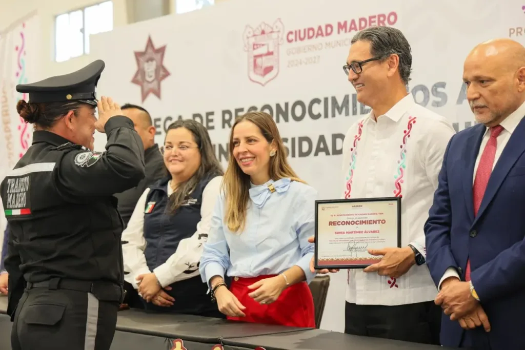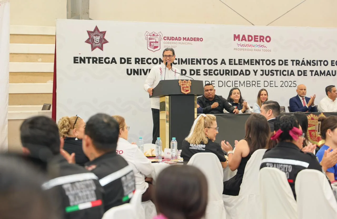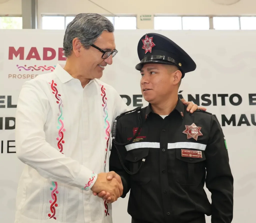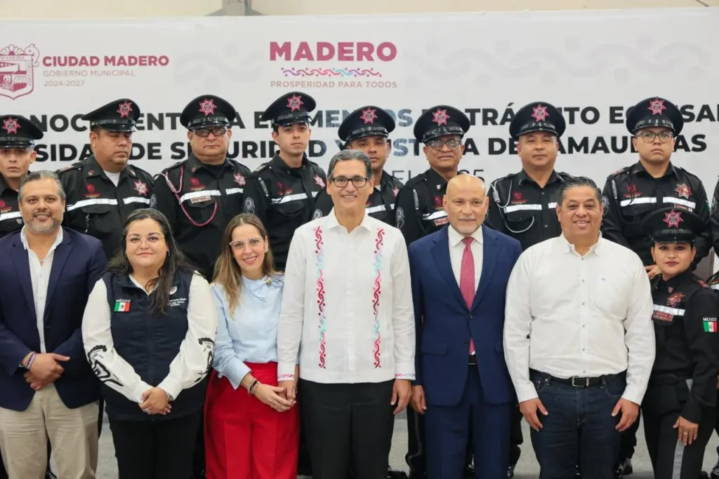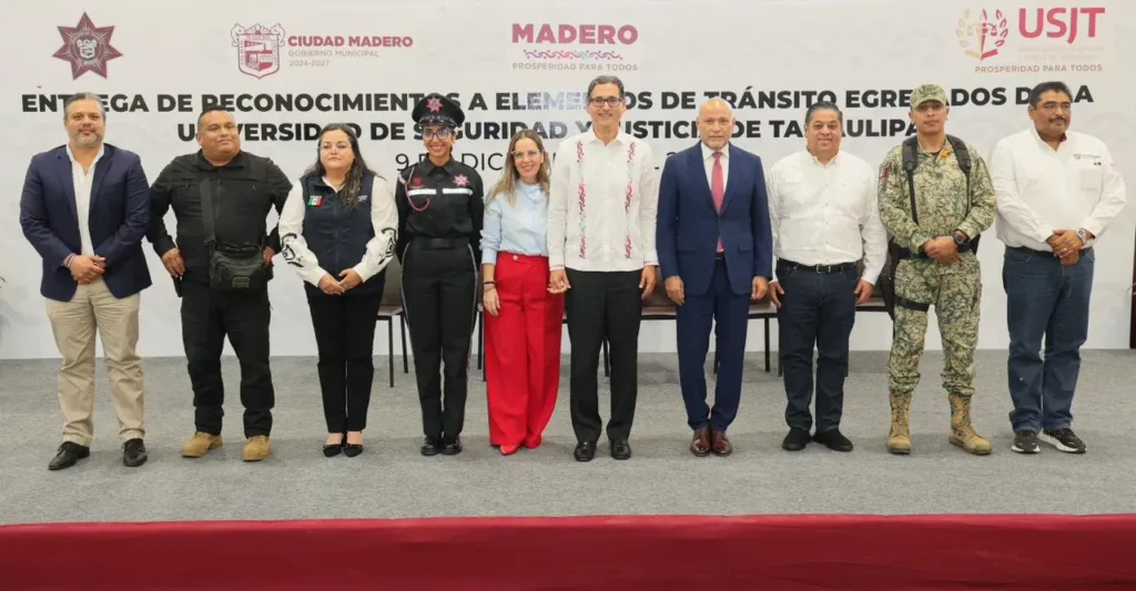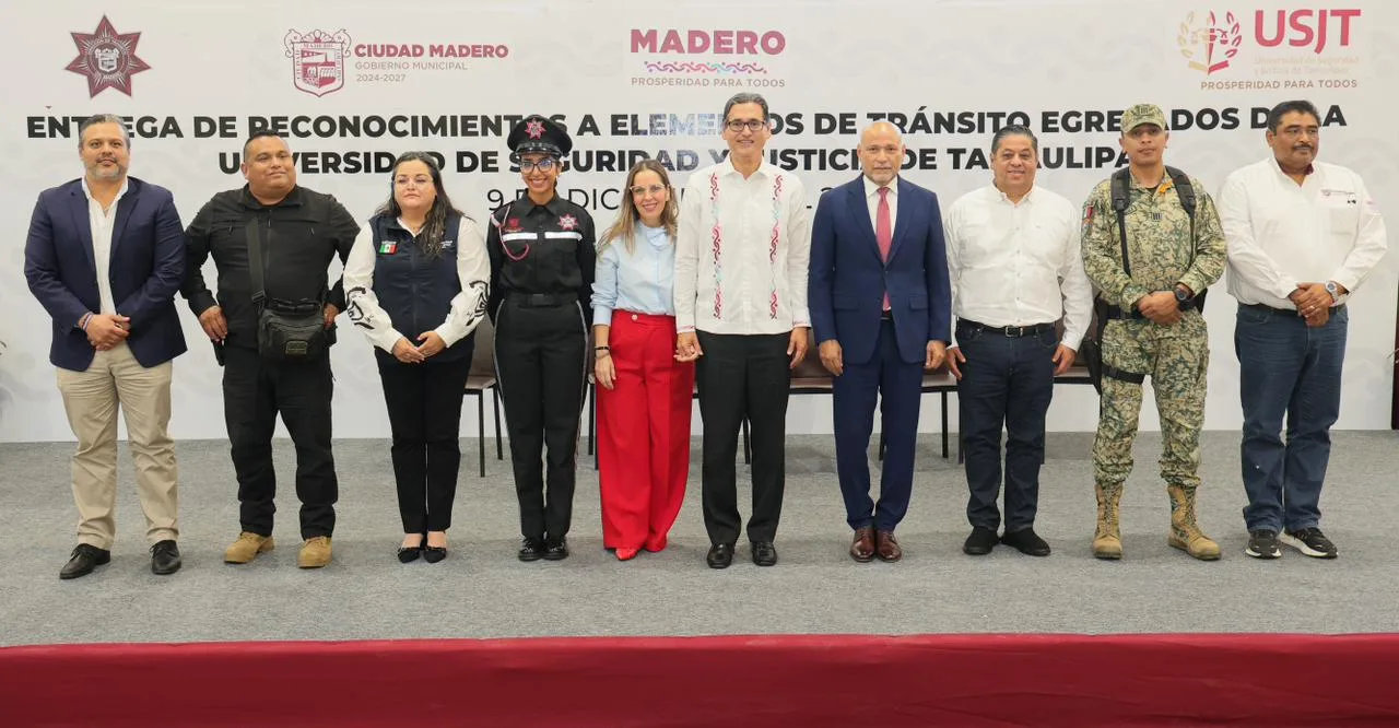 Durante una ceremonia oficial, el presidente municipal Erasmo González Robledo encabezó la entrega de reconocimientos a 30 nuevos agentes de Tránsito que culminaron su formación profesional en la Universidad de Seguridad y Justicia de Tamaulipas (USJT). El edil destacó que este grupo representa una generación preparada y comprometida con el bienestar de la sociedad maderense.