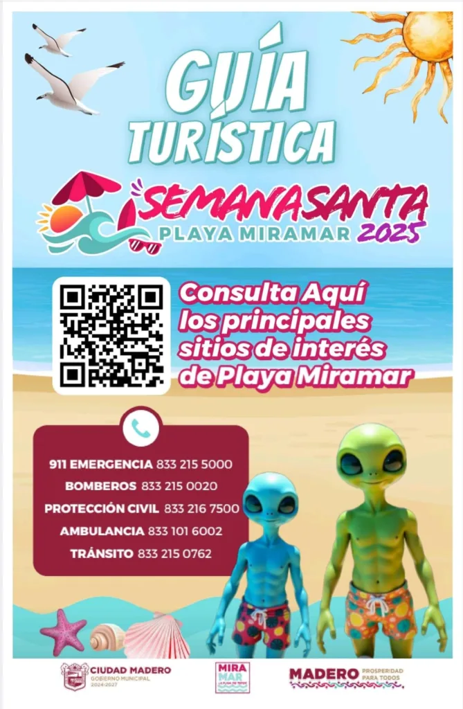 Guía turística con QR de Playa Miramar fue presentada por el presidente municipal Erasmo González Robledo. El cartel informativo incluye un código QR que brinda acceso a 28 puntos de interés turístico, con enfoque especial en Semana Santa.