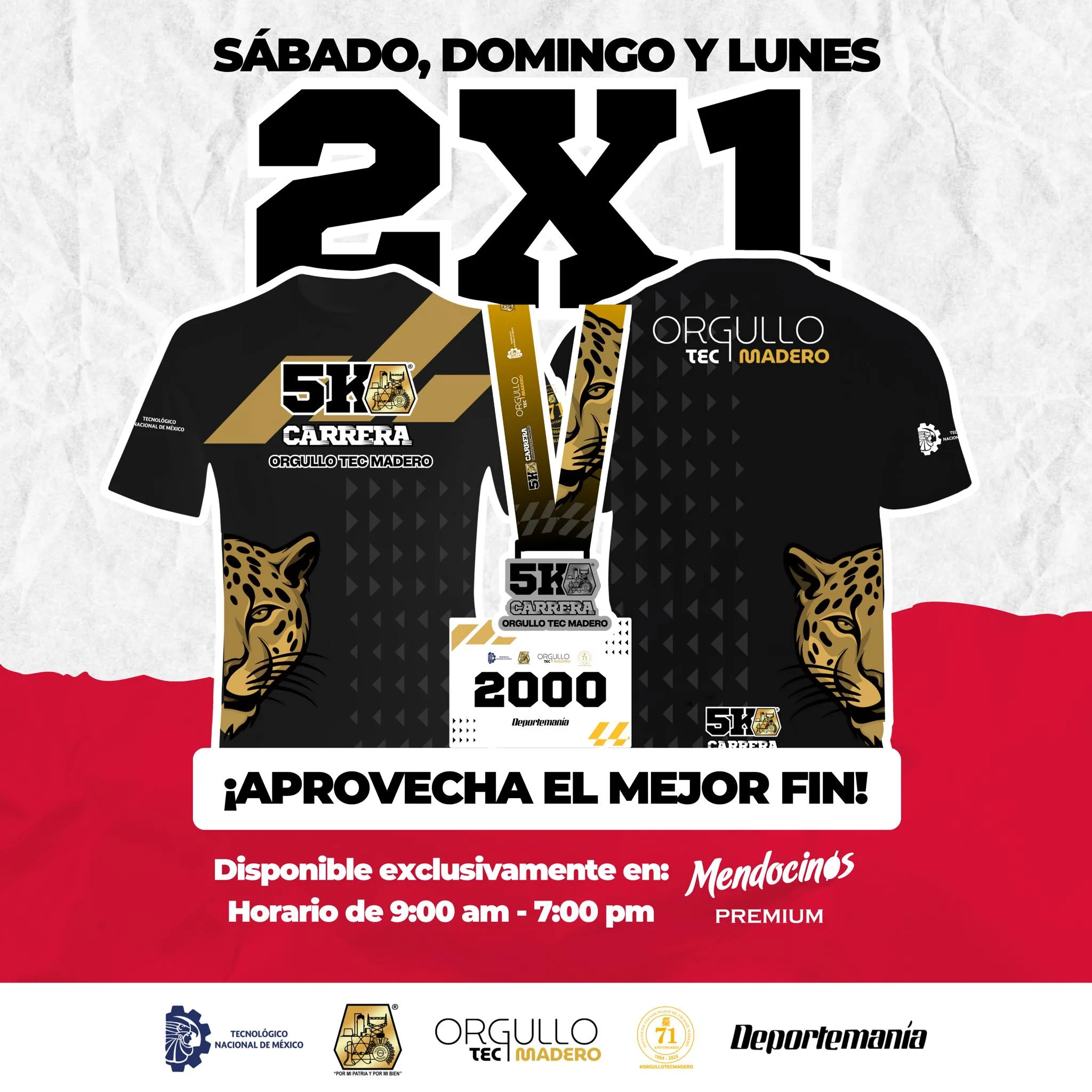 Los organizadores de la 5K Carrera Orgullo Tec Madero anunciaron una promoción especial de inscripciones 2×1 válida únicamente durante este fin de semana largo. La oferta estará disponible el sábado 16, domingo 17 y lunes 18 de noviembre en la tienda Mendocinos Premium, con un horario de 9:00 a.m. a 7:00 p.m.