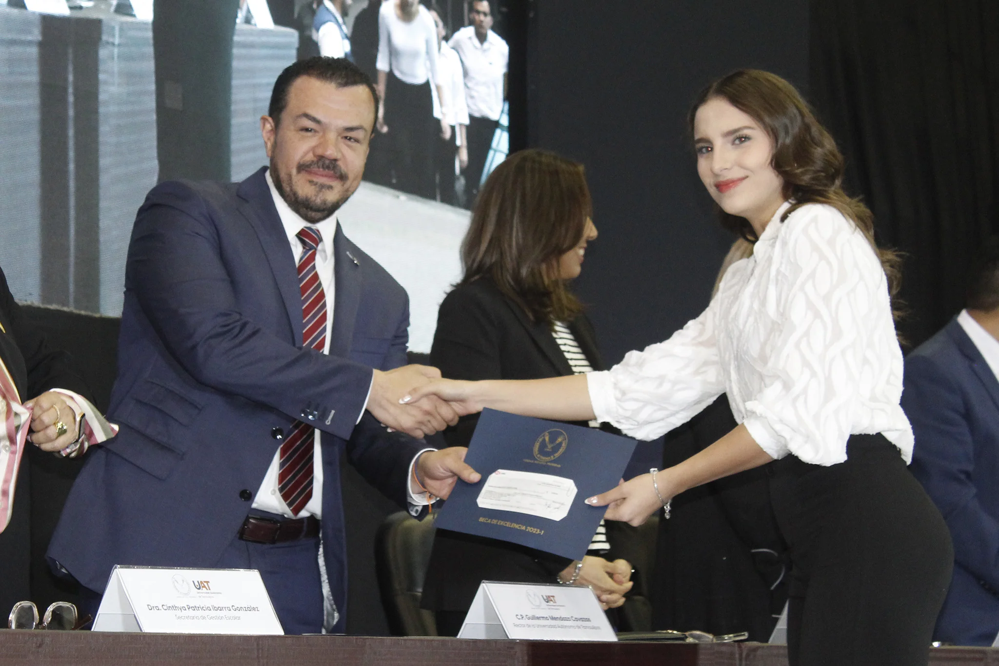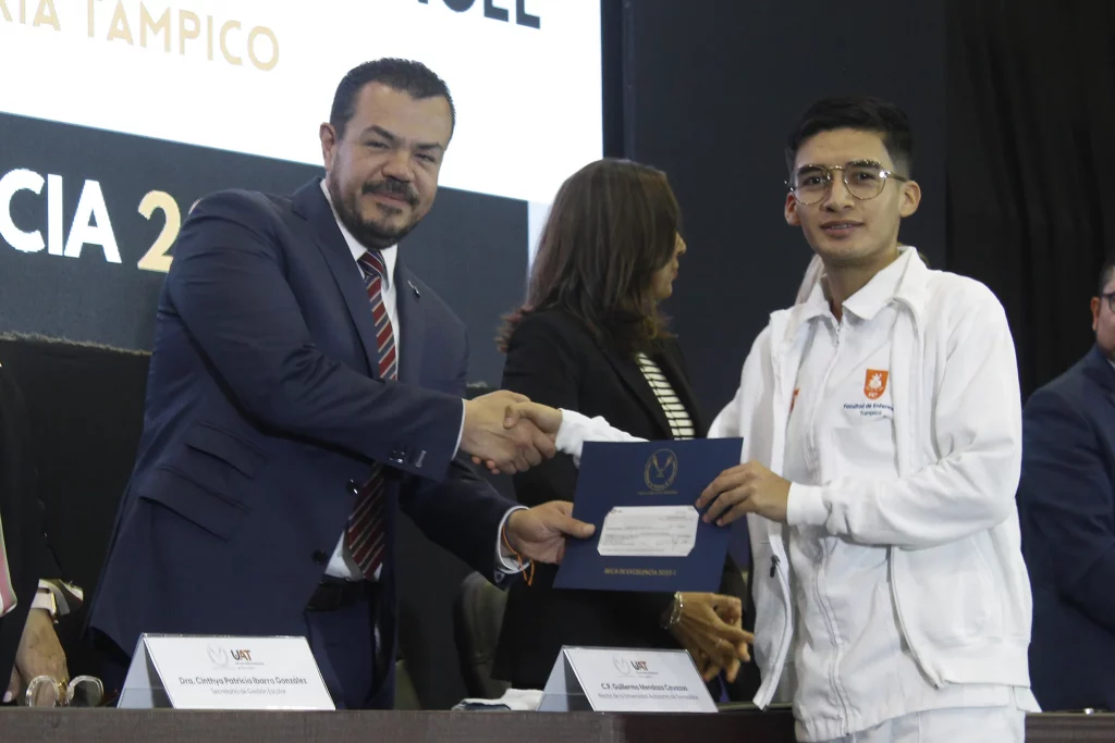 La Universidad Autónoma de Tamaulipas (UAT) otorgó becas de excelencia a estudiantes destacados en el Gimnasio Olímpico de Tampico, en un evento presidido por el rector Guillermo Mendoza Cavazos. La ceremonia reconoció a 180 estudiantes del sur de Tamaulipas por sus altos promedios académicos.